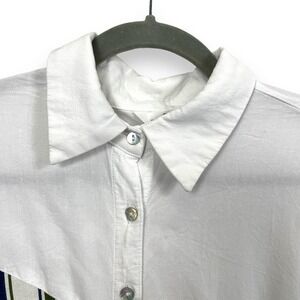 BESS Womens Top XL White Green Linen Blend 3/4 Sleeve Boxy Fit Button Down