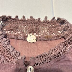 Free People Charming vintage style dress in mauve. Features delicate lace details and button accents.