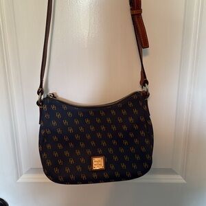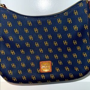 Chic Dooney & Bourke bag with blue base and gold logo pattern. Ideal for daily wear. Gently used in like new condition