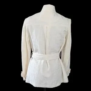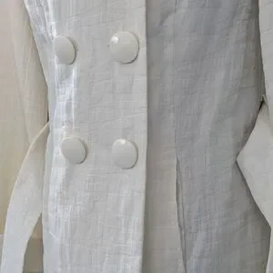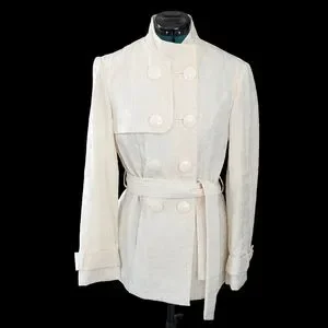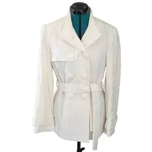 Stylish off-white trench coat with a double-breasted design. Features a matching belt and button details. Lightweight & perfect for a chic look Spring look!