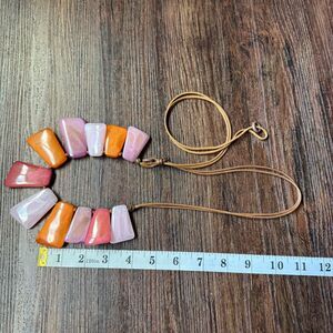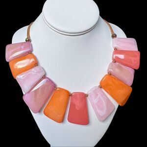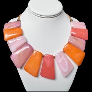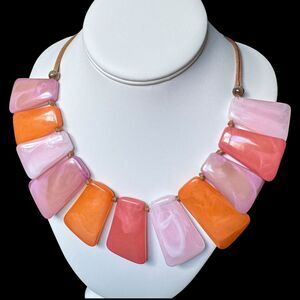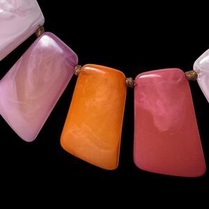 This is a corded necklace of large plastic cabochon like bright pink, light pink and orange beads that are like rectangles but more unevenly shaped. They have a swirly pattern in them that is pretty. I don't know if they are resin, acrylic etc.