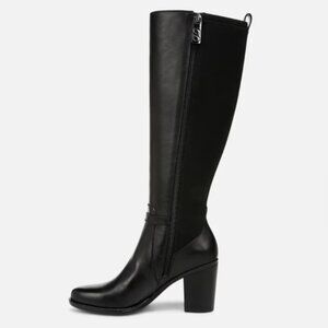 NWT - Naturalizer Kalina Stretch Boot. Wide calf is VERY generous with comfort back goring panel. Uppers are leather & neoprene with 100% recycled lining. Boot features an attractive rounded toe, sleek block heel, side zip closure, pull tab and decorative side buckle. Sculpted insole has the signature Contour+Comfort technology with arch and heel support & a foam cushioned breathable lining. Boot size is 12M, heel height 3 1/4 inch, shaft height 14.37 inches, shaft width 16.14 inches.