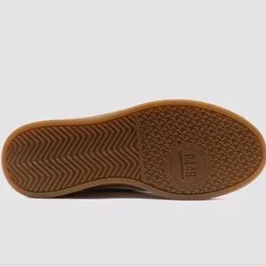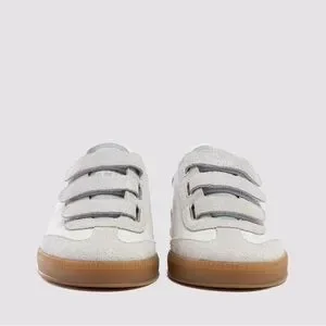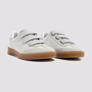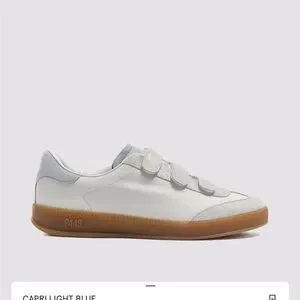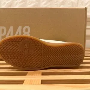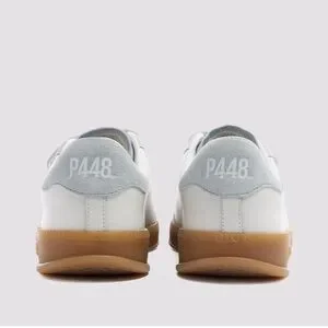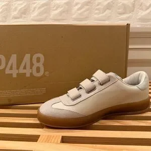 Stylish P448 sneakers with a white leather body. Gray suede accents. Comfortable gum sole. Velcro strap closure.