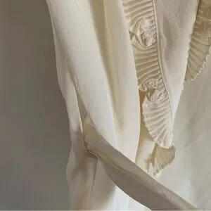 Beautiful silk blouse with gathered ruffle retails at neckline and sleeves. Wrap style. Features a v-neck collar that is trimmed with a fan-like pleat that matches the cap sleeve. Front shoulders have rows of sewn mini tucks. Wrap belt can be worn in front or back. Romantic and very feminine.