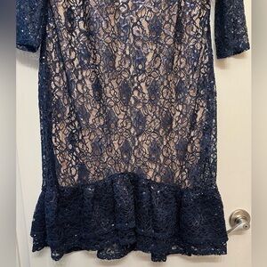 This elegant navy lace dress features a sophisticated design perfect for any occasion. The intricate lace overlay adds a touch of luxury, making it a standout piece in your wardrobe.