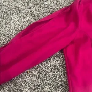 Stylish pink and black dress with a V-neck design. Features long sleeves and a chic color block pattern.