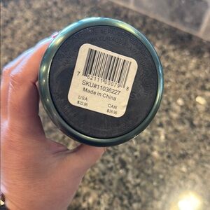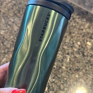 Sleek metallic green mug with black lid. Ideal for beverages on the go.
