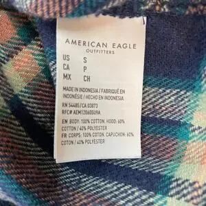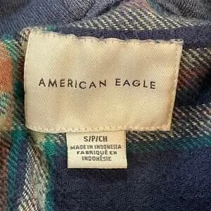 American Eagle Plaid Hooded Button Front Flannel Shirt Blue Green Women’s S