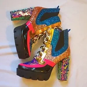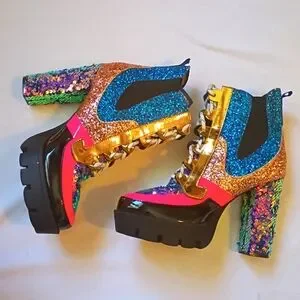 Step out in style with these vibrant glitter platform ankle boots. Featuring a dazzling mix of blue, pink, and gold, these shoes are perfect for making a statement. The chunky heel and lace-up design offer both comfort and flair.