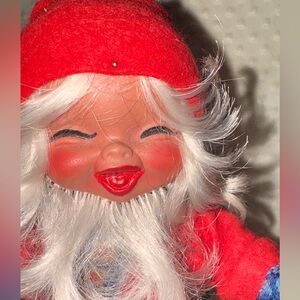Charming Santa doll in a vibrant red outfit. Features colorful trim and black pants. Perfect for holiday decor.
