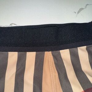 Chic Burberry leggings with iconic plaid design. Features tan, black, and red colors. Ideal for stylish outings.
