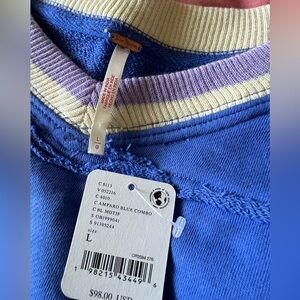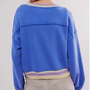 Chic knit top by Free People. Features a blue body with lavender trim. Ideal for everyday style.