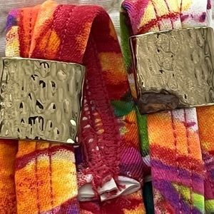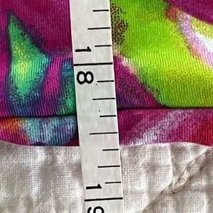 Big, bold and beautiful tropical print. Featuring adjustable straps and a modesty skirt. Some discoloration on gold tone strap embellishments.