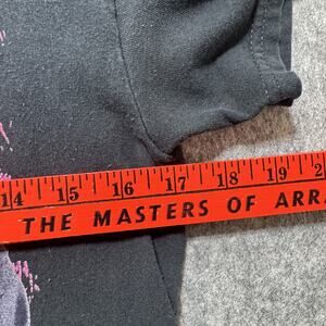 Single stitch sleeves and hem, classic 1990s black t-shirt cut, faded neck label typical of 90s tees.