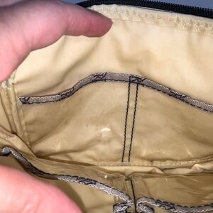 Keywords: Lauren Ralph Lauren, monogram pouch, cosmetic bag, makeup bag, travel pouch, small bag, accessory bag, zippered pouch, beige bag, brown bag, designer bag, travel accessory, RL logo, cosmetic organizer, makeup organizer