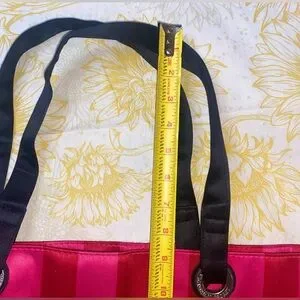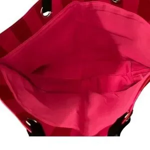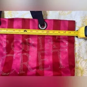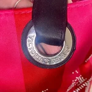 Stylish tote with vibrant red and pink stripes. Features sparkling VS logo detail. Perfect for a fashionable touch.