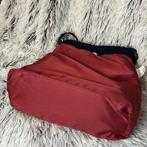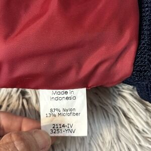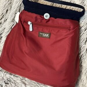 The Sak Navy Bag is a stylish and functional purse with a classic navy blue exterior and red lining. This lightweight packable bag features a rectangular shape with thin double handles in navy blue. The snap closure and small size make it perfect for casual occasions, while the nylon blend material ensures durability. The silver hardware tag and chain add a touch of bling. Perfect for women on the go who want a versatile and practical handbag.