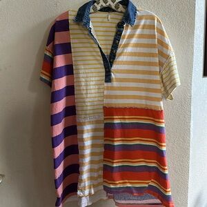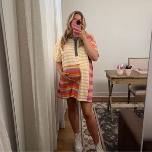 The perfect retro-inspired mini dress featured in an effortless tee silhouette with button-front neckline and contrast stripe print for added dimension.