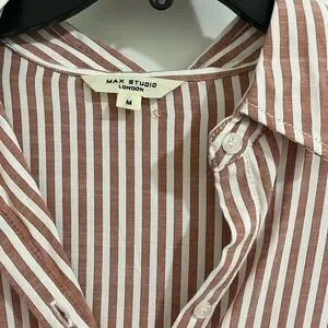 Chic long sleeve dress with pink stripes. Features a classic collar and tiered skirt. Perfect for versatile styling.