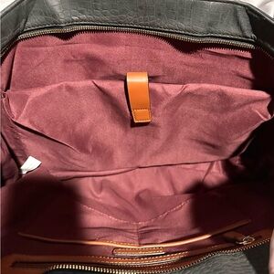 Cloth maroon color interior with large zipper pocket, 2 slip pockets and laptop or tablet holder on the other.