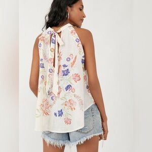 Floral print with beautiful color palette! Sleeveless top that ties in th 100% cotton; perfect for those hot summer days . Perfect for any occasion, this cream top features vibrant floral designs that add a touch of color to your wardrobe.