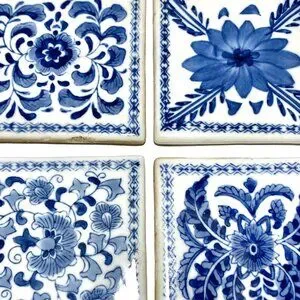 Set of 4 Vintage Blue + White Ceramic Tiles