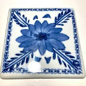 These tiles are meant to be used with 4 protective discs on the underside of each. Can be used as coasters, wall décor, etc. Asian design in blue. Sticker on the backs read “Centrum Ceramics.” The edges and underside reveal that they are vintage. No damage, in VG vintage condition.