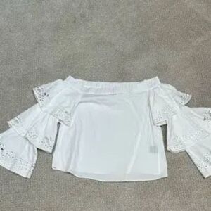 Intermix white off the shoulder blouse with triple tiered eyelet trim long bell sleeve and elasticized neckline.