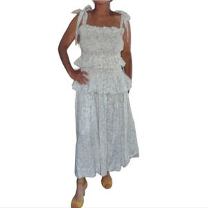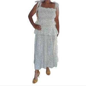 This charming shirred maxi dress by House Of Harlow 1960 radiates feminine beauty with its sweet and subtle floral print. This elegant dress features a straight neckline with shirred bust, thick shoulder straps with tie-up details and a tiered skirt, Size Medium, 55% Linen, 45% Rayon, White With Flowers! Very soft Linen! See Pictures for exact Dress and Check out the video!