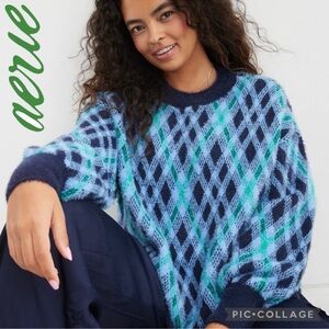 Soft and plush Aerie argyle sweater in a deep navy hue. Ideal for all your cozy days. This ultra-soft crewneck sweater is in excellent condition and was only worn a few times. Perfect for layering with leggings. Comes from SF home. Cross posted