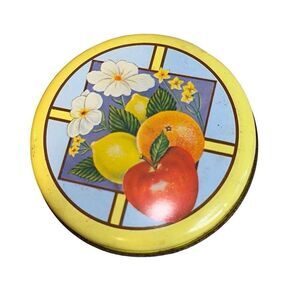 Vintage decorative Boston Apricot Tea Tin fruit + lid yellow, fruit, flowers circular