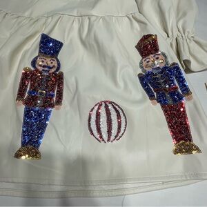 Design: The dress features a tiered babydoll style, a V-neck, long puff sleeves with ruffled cuffs, and a collar. It is a mini length and has colorful nutcracker and ornament graphics along the bottom hem, which include sequins. Has pleather like feel to fabric.