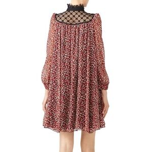 - Red and cream floral pattern with black lace Victorian collar