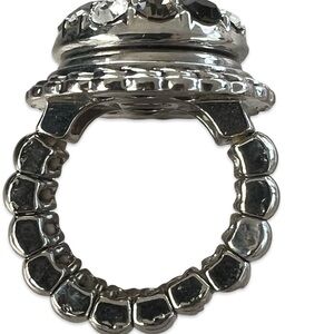 This exquisite ring showcases a striking combination silver and black hues, with a large circular face adorned with a cluster of shimmering faux gemstones. The textured band adds a unique touch, while the silver-toned setting enhances the brilliance of the clear and dark stones. Perfect for making a bold statement. The band is adjustable.
