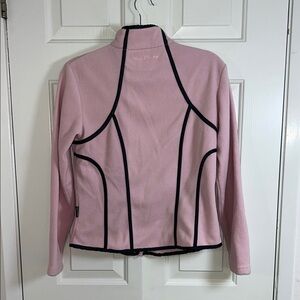 This ski and snow jacket combines a chic pink hue with striking black trim for a modern, tailored look. Designed with a high neckline and a fitted silhouette, it offers both style and functionality on the slopes. The jacket's clean lines and minimal embellishments make it a sophisticated choice for winter adventures.