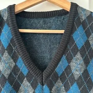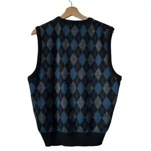 Keywords: argyle vest, v-neck vest, sleeveless sweater, knit vest, preppy style, smart casual, layering piece, menswear, fall fashion, winter wear, classic pattern, business casual