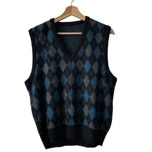 Mens Argyle V Neck Sweater Vest Blue Black Gray Sleeveless Knit Top Size M
