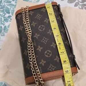 Discover elegance with this stylish brown handbag. Coated canvas with leather & gold accents. Featuring a detachable chain crossbody strap, it's perfect for any occasion.