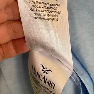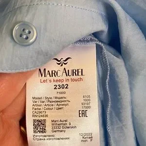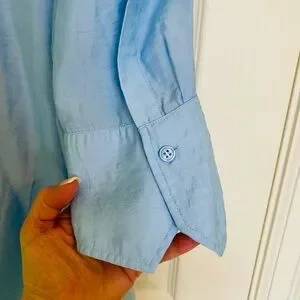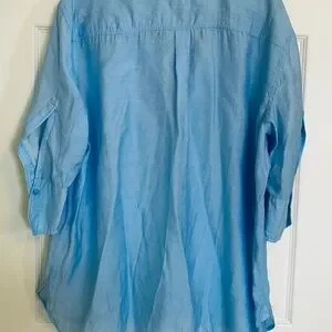 So chic! Mandarin collar and 3/4 length sleeves. The material is man made however, it has a sheen and silk like feel to it. Size is approximately a large or you could wear it oversized. Dry cleaned but, not necessary.