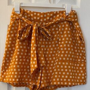 Stylish high waist shorts with a tie belt. Features an orange and white pattern. Perfect for everyday wear.