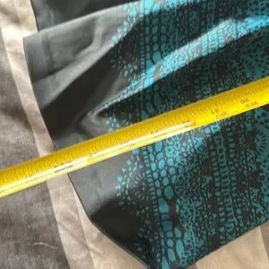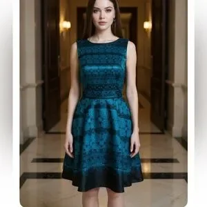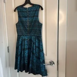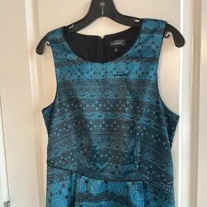 Stylish mini dress with intricate blue and black pattern. Sleeveless design. Perfect for any occasion. Teal blue size 8 no holes no rips from non-smoking home beautiful dress. Zipper in the back lined, however no pockets.