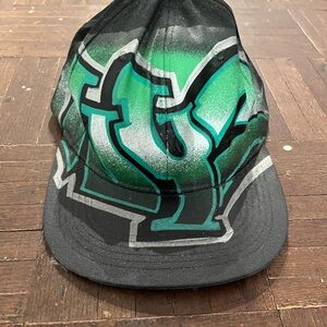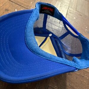 Set of seven trucker hats with various graphic designs. Includes blue, green, brown, and orange colors.
