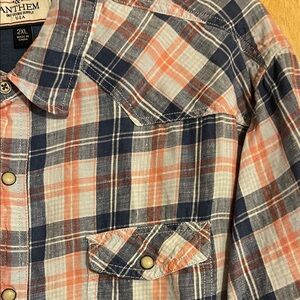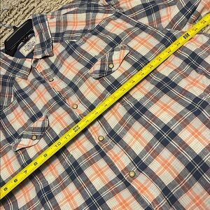 Add a touch of rustic style to your wardrobe with this plaid button-down long sleeve shirt. Featuring pearl snaps and a blue and peach plaid pattern, this shirt has a western flair.