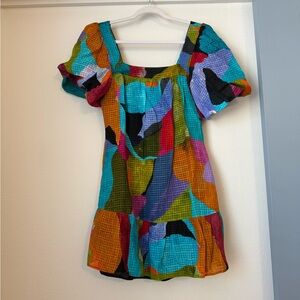 Vibrant dress with puff sleeves and a patchwork design. Features a mix of colors for a bold look.