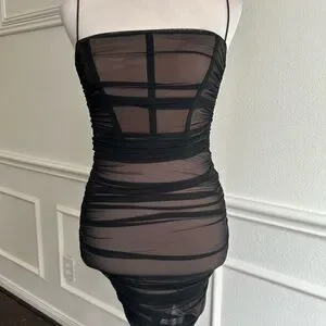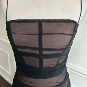Step out in style with this elegant black mesh bodycon dress. Perfect for any occasion, this dress offers a sleek and sophisticated look. Pair it with your favorite accessories for a complete ensemble. The corset type top of the dress does have some boning for extra added support. Please go to www.nookie.com.au for their size chart for a more accurate fit. Materials main 92% nylon 8% Lycra. Lining 95% polyester 5% spandex. #nookie #nookiedress #nookiebodycondress #nookieblackdress #nookiminidress