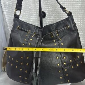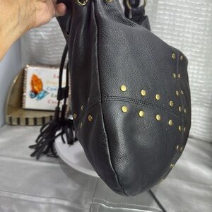 *in very good used condition. See photo for more details. Elevate your style with this chic black leather shoulder bag. Featuring elegant studded details, it's perfect for any occasion. The spacious interior and comfortable strap make it a must-have accessory.
