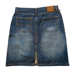 POLO Jeans Company 90s Blue Denim Knee Skirt Flag Logo. 100% cotton. Two front slit pockets and two back patch pockets. Vent opening in back of skirt.