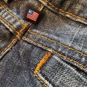 Pre-owned, good condition. Note the dark area on the back where the seams intersect is the actual denim dye. The photos make it look worse than it actually is