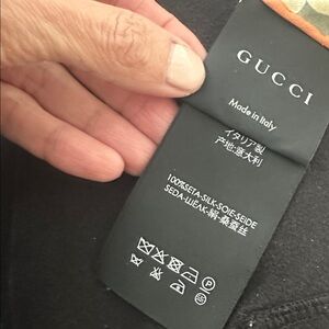 Luxurious Gucci scarf with floral design. Features orange and cream hues. Adds elegance to any look. 39 x10 inch