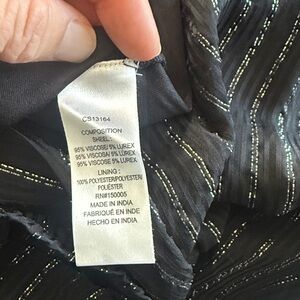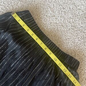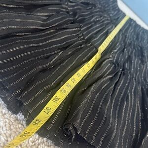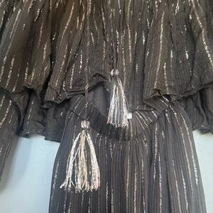 Chic 2 piece black maxi dress with subtle pin stripe accents. Flowy and stylish design. Dress up or casual. Lined skirt, cropped (non lined) flowy matching top with open wide sleeves.